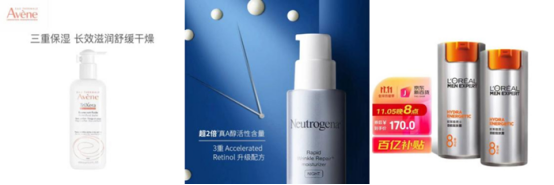 雅漾三重修護盈潤乳、露得清維A醇抗皺修護晚霜、歐萊雅勁能醒膚露