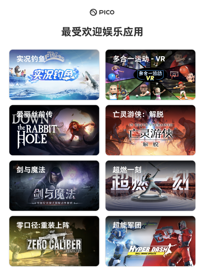 作為頭部XR品牌,PICO始終致力于幫助VR開啟大眾化之路,而豐富且優(yōu)質(zhì)的內(nèi)容和應(yīng)用生態(tài),是吸引大眾消費(fèi)者購買VR、使用VR的關(guān)鍵。近兩年全球VR技術(shù)日漸成熟,產(chǎn)品快速迭代,PICO作為國內(nèi)最完善的VR內(nèi)容平臺,亦在持續(xù)完善內(nèi)容生態(tài),積極加速與第三方的合作腳步,并在自制內(nèi)容方面大力投入,致力打造國內(nèi)應(yīng)用最豐富、最優(yōu)質(zhì)的VR內(nèi)容平臺。迄今為止PICO應(yīng)用商店已擁有超過200款國內(nèi)外優(yōu)質(zhì)的VR應(yīng)用。