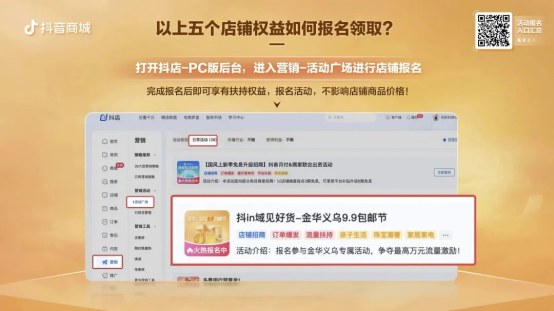 對(duì)于已入駐抖音電商且體驗(yàn)分>4.5的商家,平臺(tái)帶來了五大店鋪權(quán)益。商家打開抖店-PC版后臺(tái),進(jìn)入營銷-活動(dòng)廣場,即可報(bào)名領(lǐng)取相關(guān)權(quán)益。
