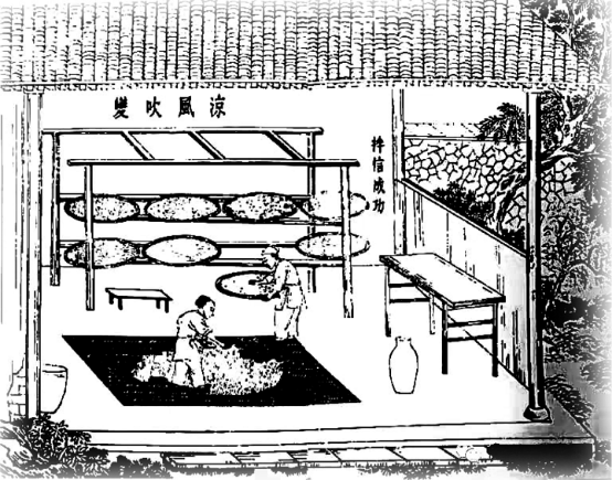 釀酒必須要用酒曲作為酒引子,沒(méi)有酒曲,即便有好米好黍也釀不出酒。為了釀出好的酒曲,宋應(yīng)星記錄道:“用楮葉包扎,懸風(fēng)處,或用稻秸罨黃,經(jīng)四十九日取用?!鼻摇吧S未足,視候不勤,盥拭不潔,則疵藥數(shù)丸動(dòng)輒敗人石米?!币馑际侵魄诵栌心托那壹?xì)心,要時(shí)常查看酒曲的發(fā)酵情況,營(yíng)造適宜酒曲發(fā)酵的環(huán)境。