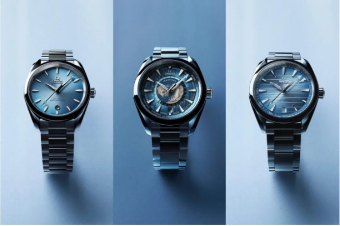 由左至右:歐米茄海馬 Aqua Terra腕表38毫米表款,Aqua Terra世界時腕表,Aqua Terra腕表41毫米表款