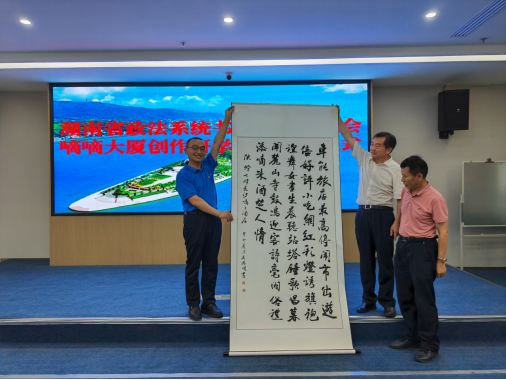 詩以言志,文以化人。以法護(hù)商,以商促文。7月15日上午,坐落于長沙市芙蓉區(qū)“中央文化區(qū)”的嘀嘀大廈五樓會議室高朋滿座,熱鬧非凡?!昂鲜≌ㄎ幕粥执髲B創(chuàng)研基地”簽約暨掛牌儀式在此隆重舉行。省政法系統(tǒng)書畫詩詞研究會主席團成員彭對喜,副會長劉慶富;詩詞分會主席陳嶺及副主席賀曦、周加良、江世炎;書法分會主席陳祥松、副主席吳若順;長沙法官文聯(lián)副主席胡軍軍等領(lǐng)導(dǎo)和嘉賓出席活動。