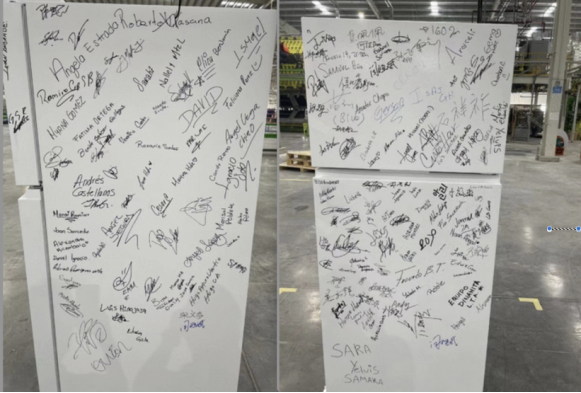 大家看到的這張照片,是今年8月19日,海信遠(yuǎn)在墨西哥的蒙特雷家電產(chǎn)業(yè)園下線的第一臺冰箱,這上面密密麻麻簽下了200多個由漢語、英語、西班牙語和韓語簽名,這些簽名來自于把原本一片荒涼的土地建設(shè)成占地達(dá)380畝的現(xiàn)代化制造工廠的建設(shè)者以及合作伙伴們,一個又一個的簽名代表著他們對產(chǎn)品質(zhì)量的確認(rèn)、對消費(fèi)者的承諾。蒙特雷工廠是海信全球29家制造基地中的一個,也是最艱難的一個,一年多來,我的同事們克服疫情、水源短缺與惡劣環(huán)境的影響,最終在一片一無所有的沙土地上高效完成了新工廠建設(shè)。目前這個制造基地已經(jīng)量產(chǎn)冰箱和烤爐產(chǎn)品,這將加速海信對北美和加勒比海地區(qū)市場的拓展。蒙特雷工廠的建設(shè)者,也讓我想起了2019年,為解決海信位于墨西哥蒂華納電視工廠的新項(xiàng)目施工試產(chǎn),我的同事白劍鋒帶領(lǐng)團(tuán)隊(duì)租住在工廠對面,確保24小時(shí)“隨叫隨到”,當(dāng)?shù)貙懼?4小時(shí)營業(yè)的便利店實(shí)際也只服務(wù)18個小時(shí),而海信員工卻始終做到24小時(shí)隨時(shí)待命支持項(xiàng)目,這種極度的勤奮與敬業(yè),就連工廠門衛(wèi)都忍不住感嘆“中國人太crazy”。