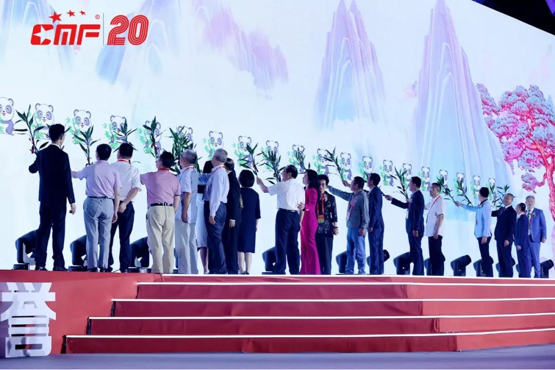 20位貴賓每人手拿一個象征四季常青,頑強生命、節(jié)節(jié)高升的竹子,“喂”向屏幕上的國寶“小小”大熊貓,當國寶得到了“食物”的給養(yǎng),茁壯成長,20個“小小”大熊貓匯聚成一個巨大的有知識、有力量、有擔當的大熊貓。