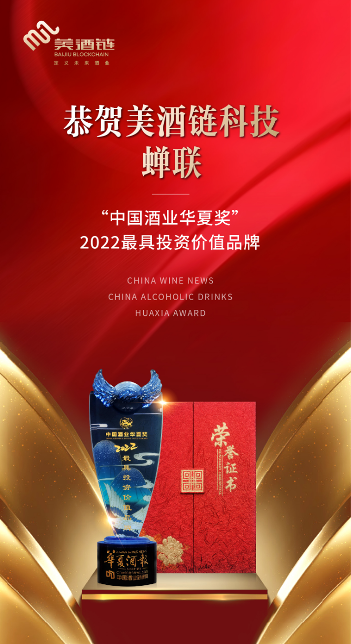 2023年“中國酒業(yè)華夏獎(jiǎng)”頒獎(jiǎng)典禮于4月10日下午在成都祥宇賓館舉行,美酒鏈科技因具有突出的科技創(chuàng)新表現(xiàn)、賦予高端白酒收藏和價(jià)值賦能的行業(yè)影響力,再次蟬聯(lián)“中國酒業(yè)華夏獎(jiǎng):2022最具投資價(jià)值品牌”獎(jiǎng)項(xiàng),這是中國酒業(yè)權(quán)威機(jī)構(gòu)和消費(fèi)大眾對(duì)美酒鏈科技創(chuàng)新精神的高度認(rèn)可。