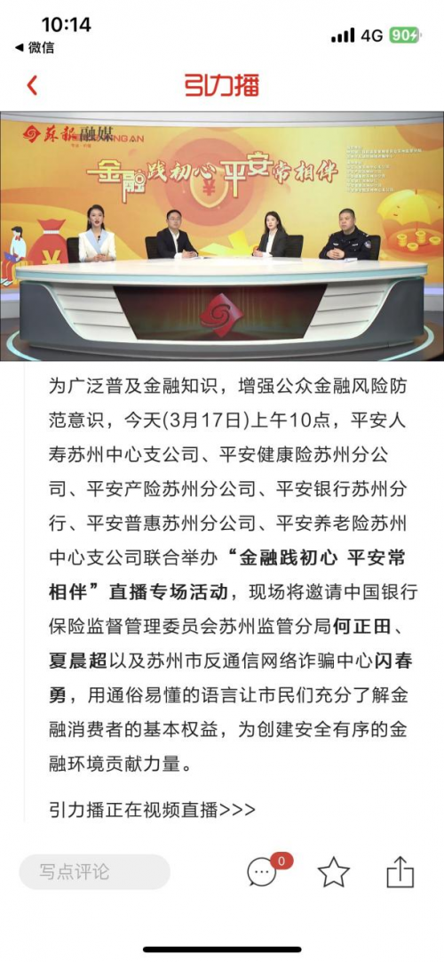 目前,平安蘇州地區(qū)六家專業(yè)公司在蘇州日報引力播APP平臺線上舉辦了“金融踐初心 平安常相伴”直播主題活動。直播邀請到中國銀行保險監(jiān)督管理委員會蘇州監(jiān)管分局何正田、夏晨超以及蘇州市反通訊網(wǎng)絡(luò)詐騙中心閃春勇,用通俗易懂的語言讓市民們充分了解金融消費者的基本權(quán)益、反詐知識,守護好自己的錢袋子。直播觀看人數(shù)達11.2萬人。